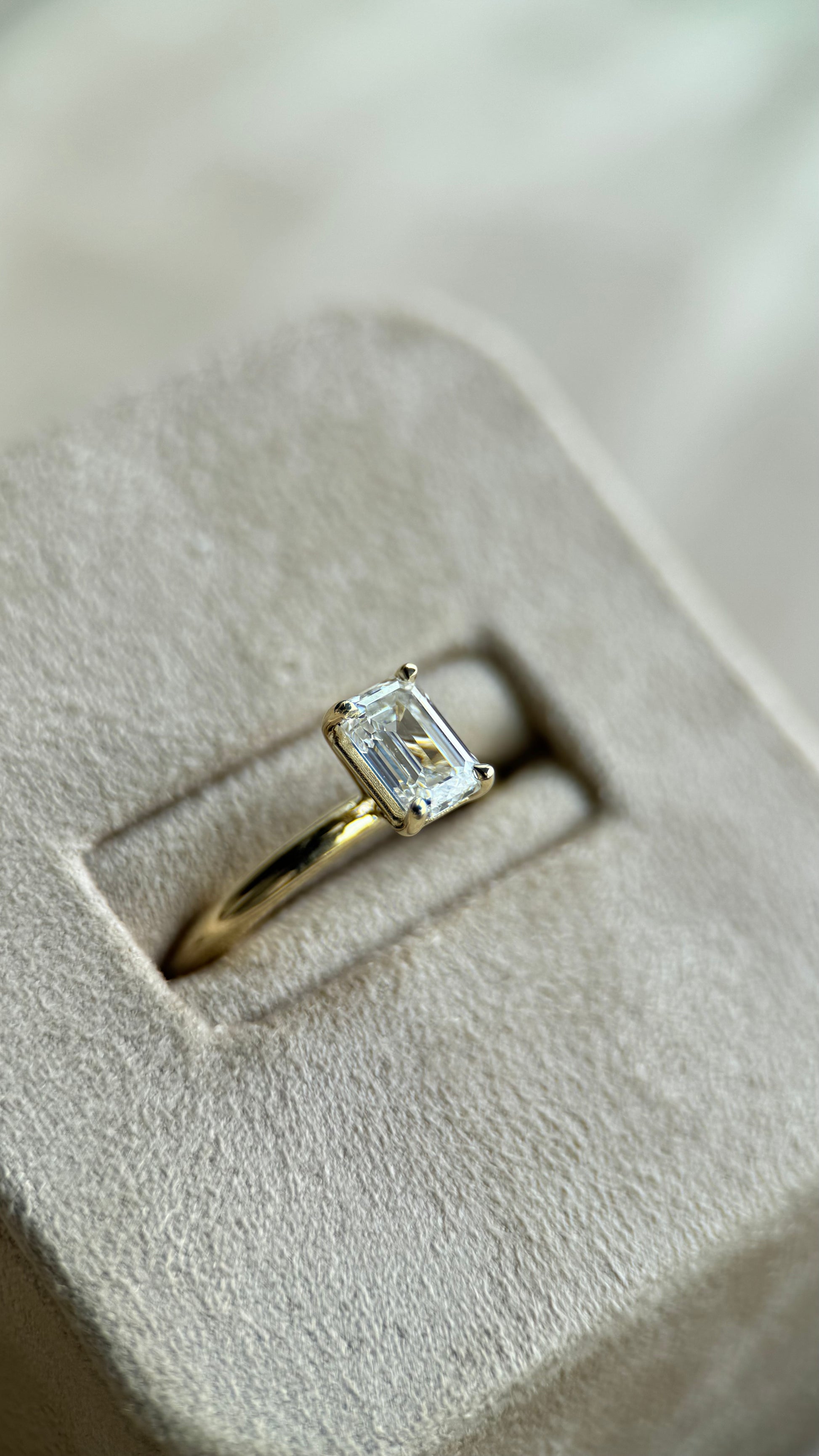 El anillo Annelise refleja la esencia de lo clásico con un aire refinado. Su diamante corte Esmeralda, conocido por sus destellos amplios y claros, se sostiene con cuatro uñas firmes y un soporte discreto debajo que aporta seguridad sin restar protagonismo. La montura lisa y la banda de 2 mm mantienen un diseño limpio y equilibrado, creando una pieza sobria y sofisticada que nunca pasa de moda.