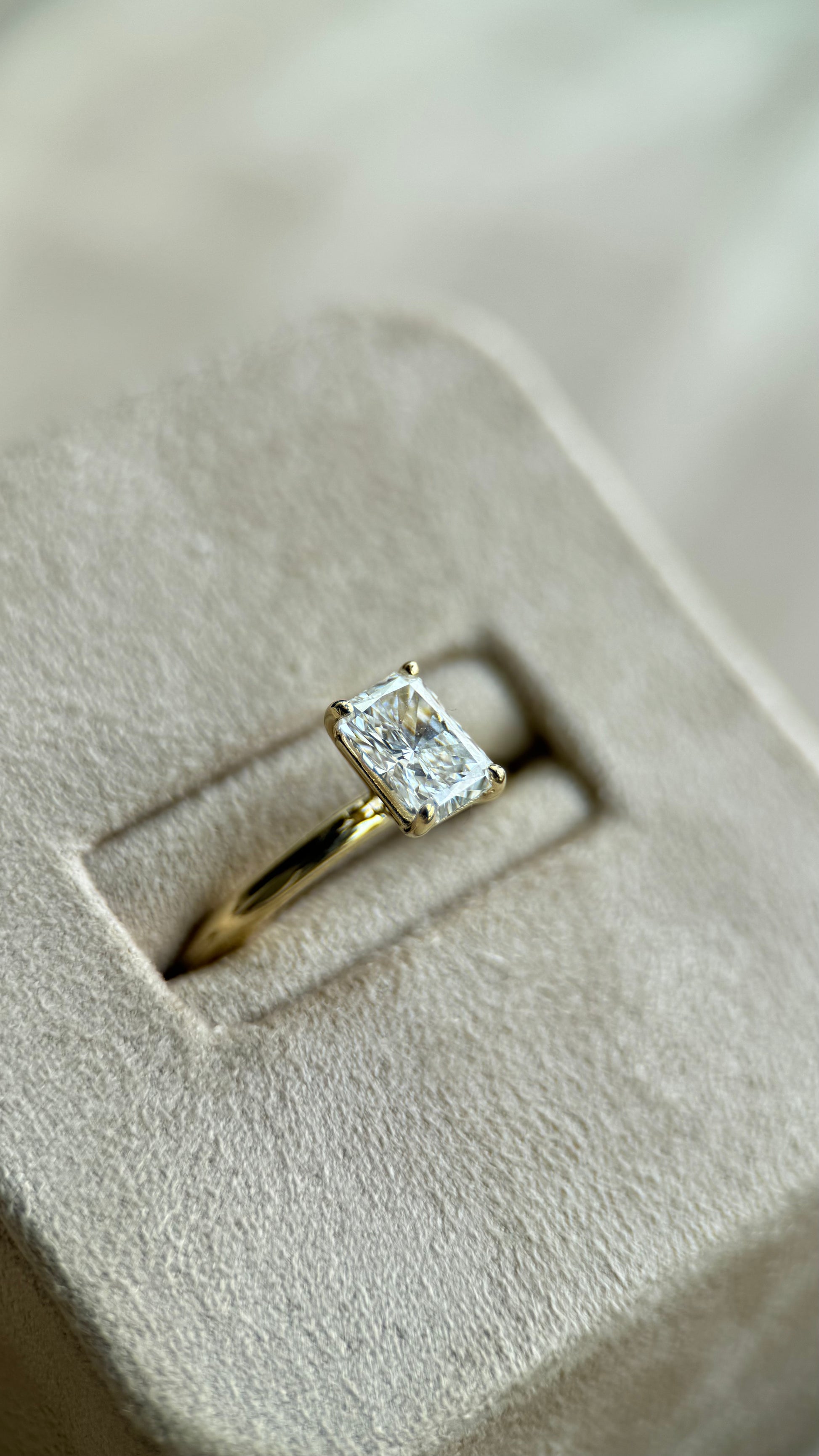 El anillo Celia refleja la armonía entre brillo y geometría en un diseño sobrio y sofisticado. Su diamante corte Radiante, conocido por unir el resplandor del redondo con la elegancia recta del esmeralda, se sostiene con cuatro uñas firmes y un soporte liso debajo que aporta seguridad y estabilidad. Una pieza de líneas limpias que transmite distinción y un estilo atemporal.