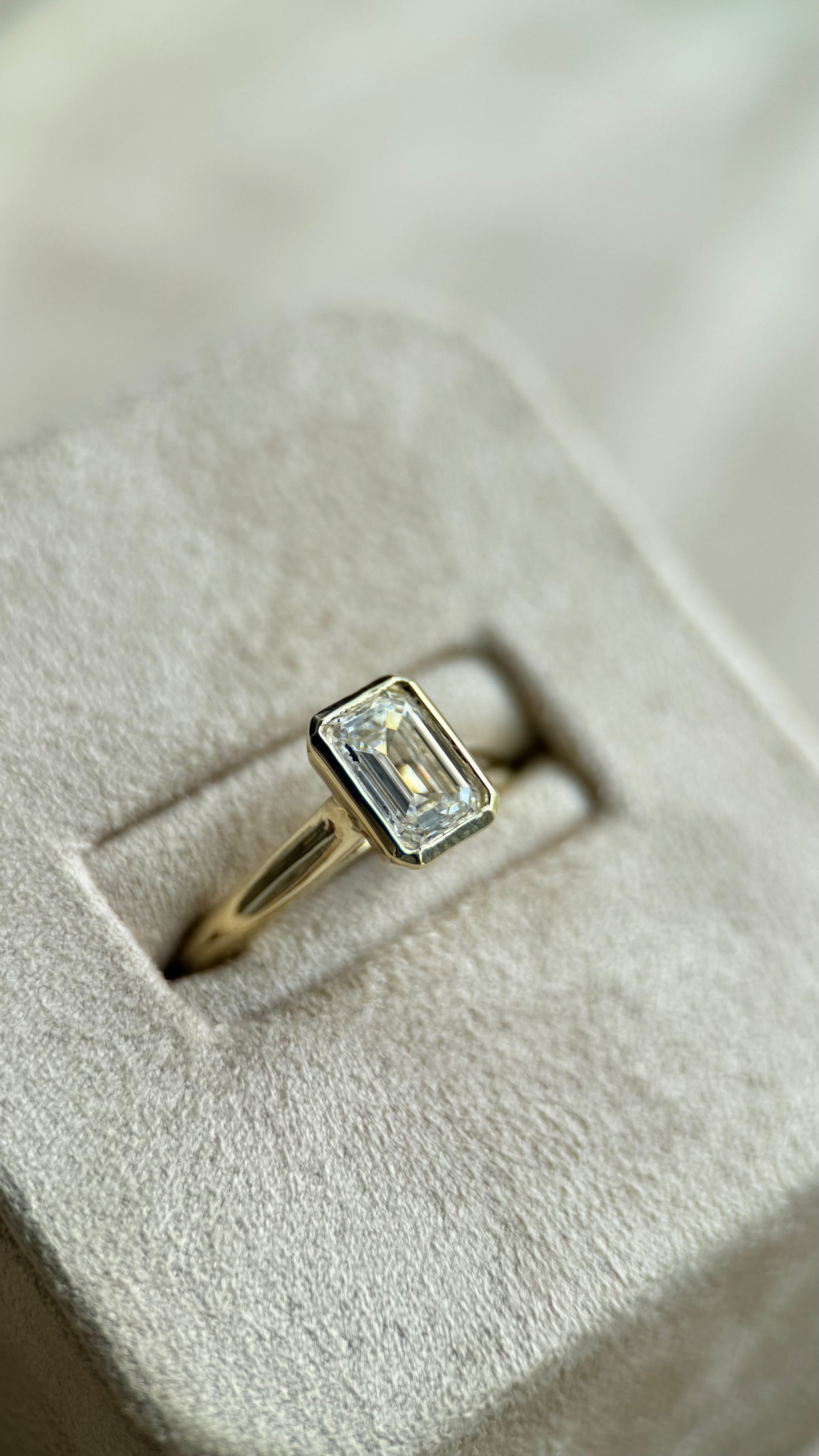 El anillo Georgia es la definición de elegancia atemporal. Su diamante corte Esmeralda, de destellos amplios y refinados, se realza en un diseño tipo catedral que eleva la piedra con majestuosidad. La montura biselada envuelve la gema con firmeza y delicadeza, mientras la banda de 2 mm aporta equilibrio y proporción perfecta. Una pieza sofisticada, pensada para quienes buscan un estilo clásico con carácter moderno.