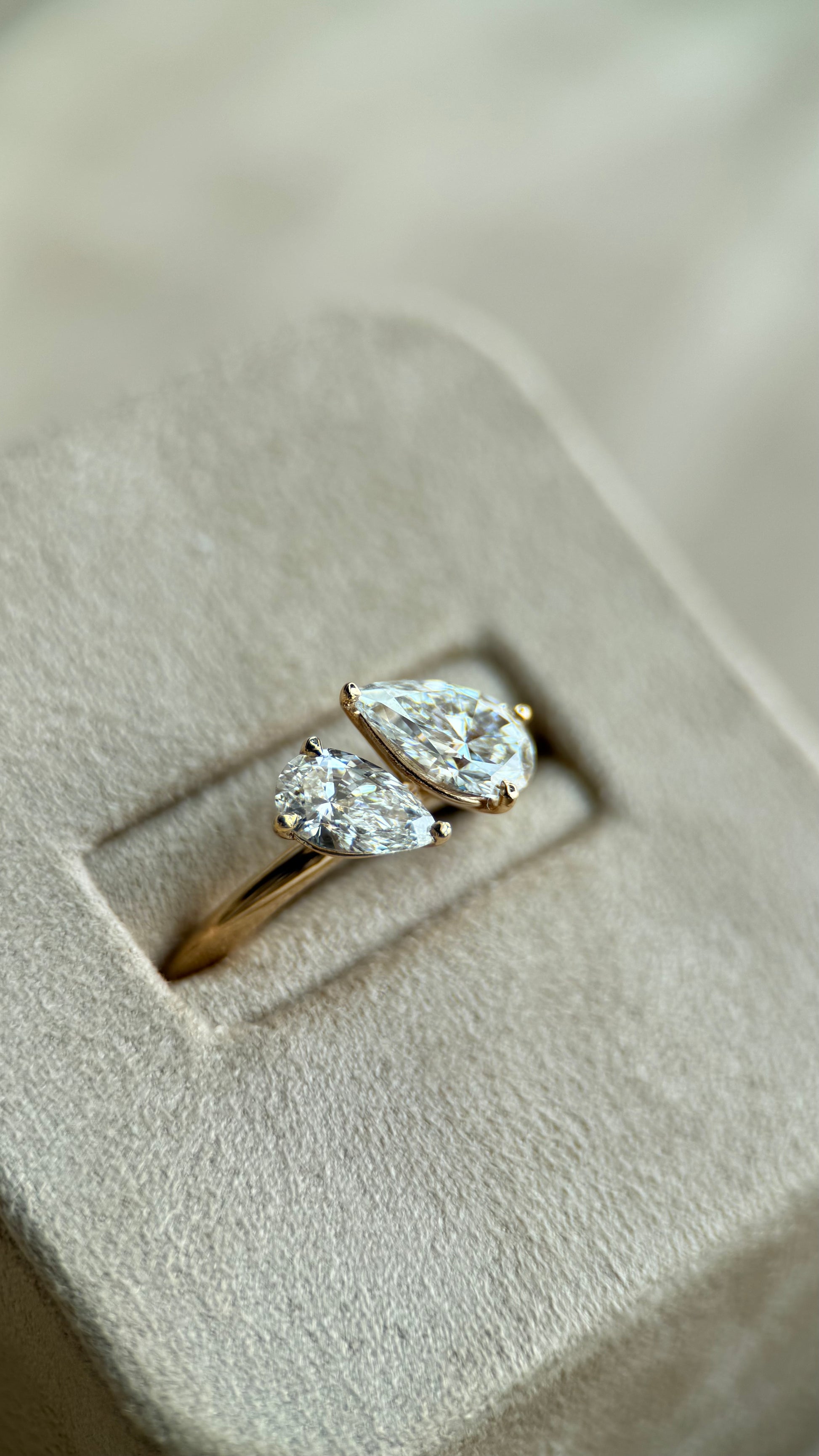 El anillo Luciana celebra la unión de dos caminos en un diseño lleno de simbolismo. Con dos diamantes corte Pera enfrentados, cada uno montado con tres uñas, la pieza refleja la conexión de dos almas que se complementan y se equilibran mutuamente. Su estilo Toi et Moi lo convierte en un anillo único, romántico y significativo, ideal para representar una historia de amor que se entrelaza en un mismo destino.