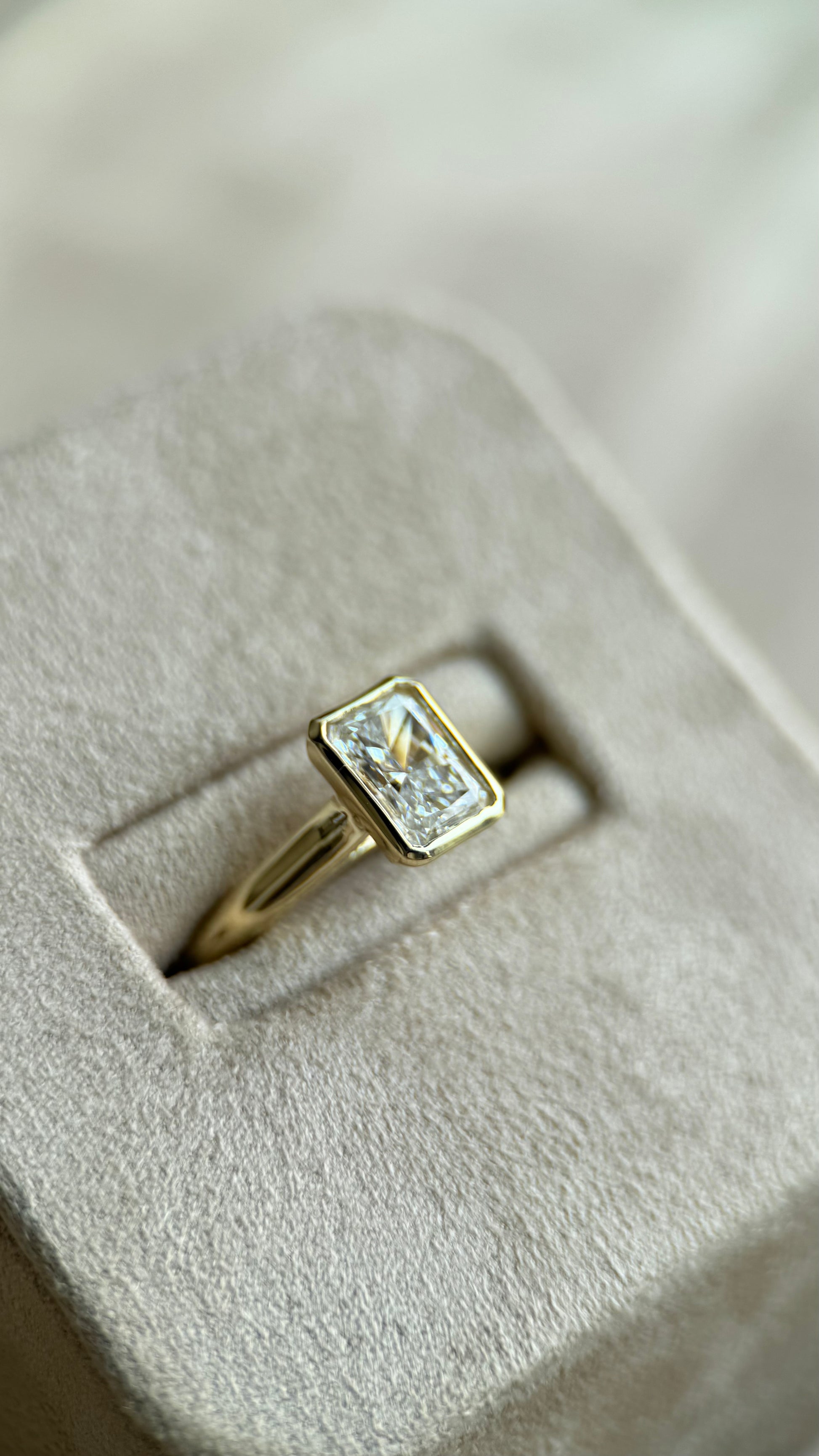 El anillo Mirabella une el esplendor del diamante corte Radiante con la elegancia de un diseño clásico. Su montura tipo catedral eleva la piedra con majestuosidad, mientras el bisel abraza cada faceta para resaltar su brillo intenso y su forma única. Una pieza que transmite presencia, sofisticación y un simbolismo atemporal, pensada para quienes buscan un solitario con carácter y distinción.