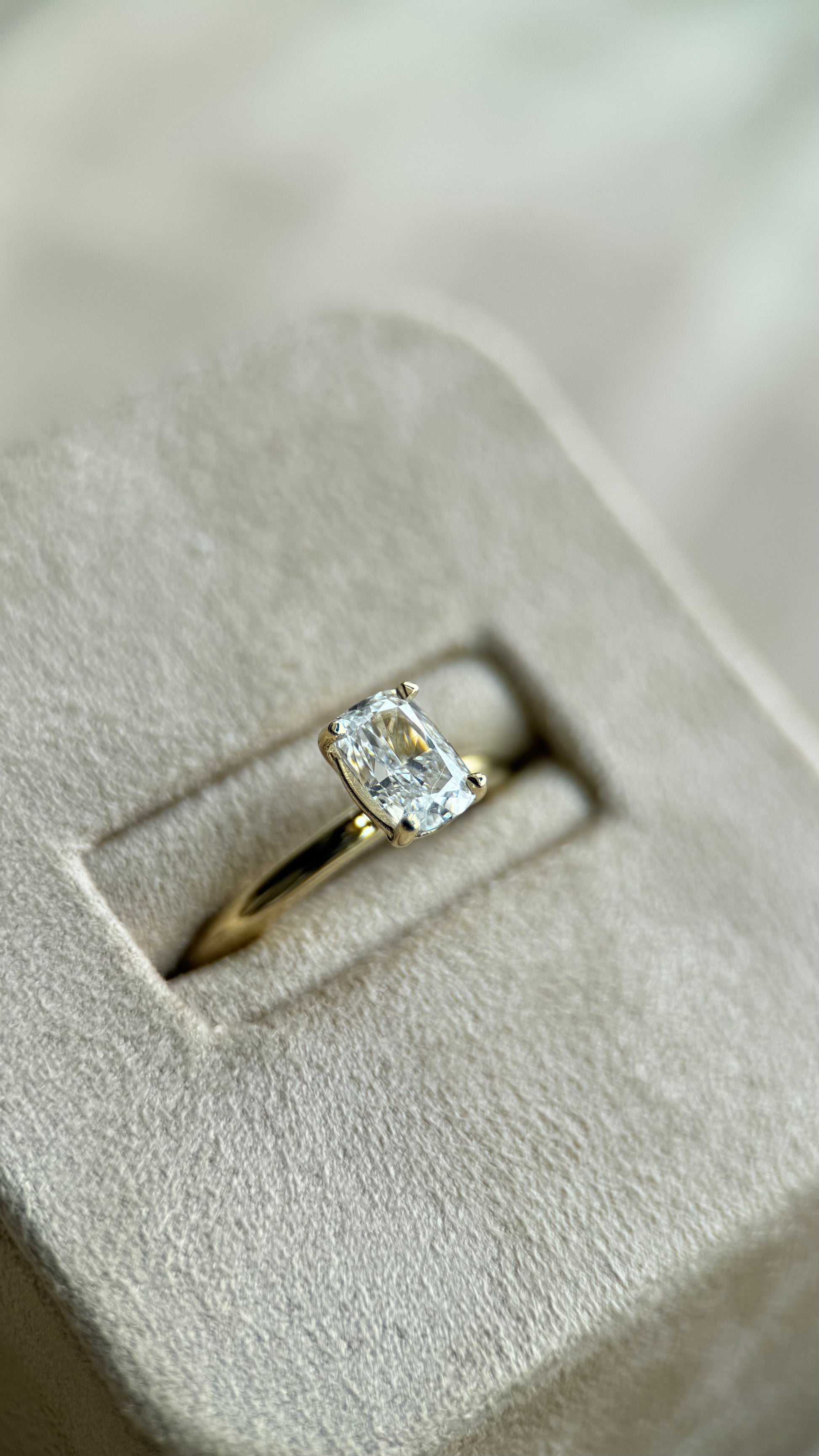 El anillo Sabrina combina sutileza y distinción en un diseño que realza cada detalle. Su diamante corte Cushion Elongated, sostenido por cuatro uñas con soporte inferior en forma de halo discreto, refleja destellos suaves y envolventes. La montura lisa mantiene un perfil limpio y elegante, permitiendo que la piedra central sea la protagonista absoluta. Una pieza pensada para transmitir armonía, estilo y un brillo eterno.