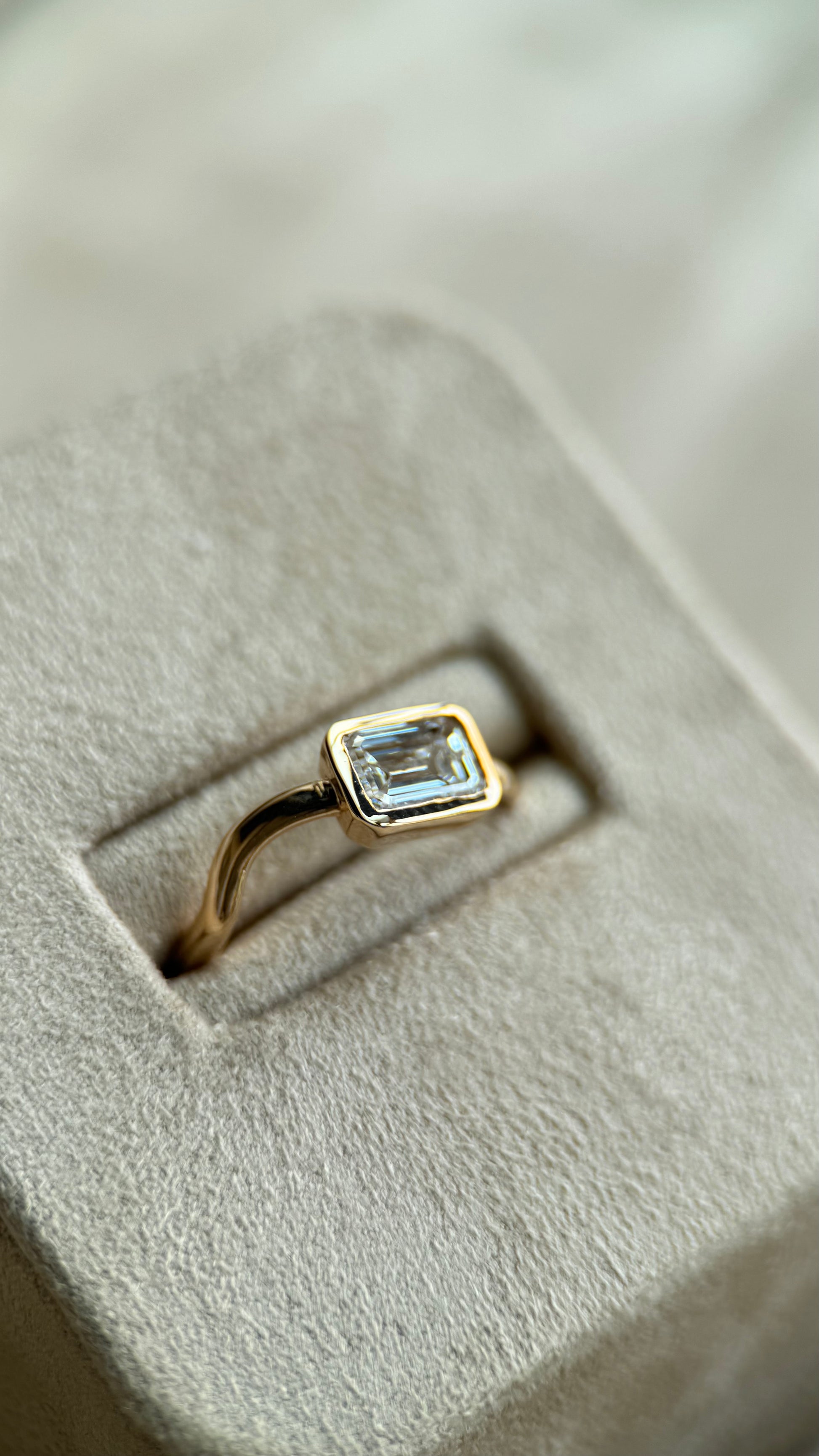 El anillo Viviana combina modernidad y elegancia en un diseño único. Su diamante corte Esmeralda, de líneas claras y destellos serenos, se sostiene en una montura bicelada que aporta seguridad y estilo. La argolla curveada asimétrica de 2 mm rompe con lo convencional, creando un juego de formas que transmite movimiento y originalidad. Una pieza para quienes buscan un anillo que refleje personalidad y distinción.